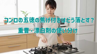 ガスコンロの五徳の焦げ付きが落ちない原因と、重曹・漂白剤の正しい使い分けを解説。頑固な油汚れや黒ずみを安全に落とす方法とNG習慣も紹介します。