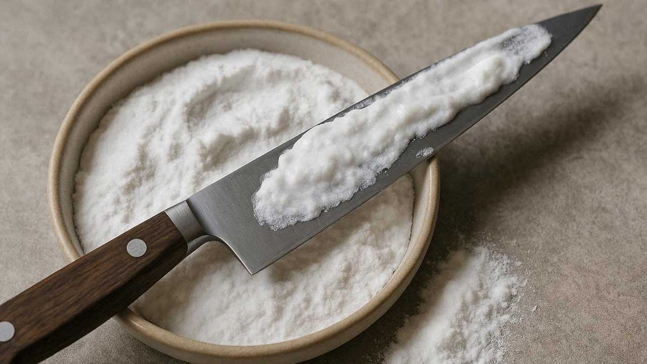 やり方は、重曹に少量の水を混ぜてペースト状にし、茶色い点の部分にのせます。その後、やわらかいスポンジや布で、刃の流れに沿って軽くこすります。力を入れすぎないことがポイントです。