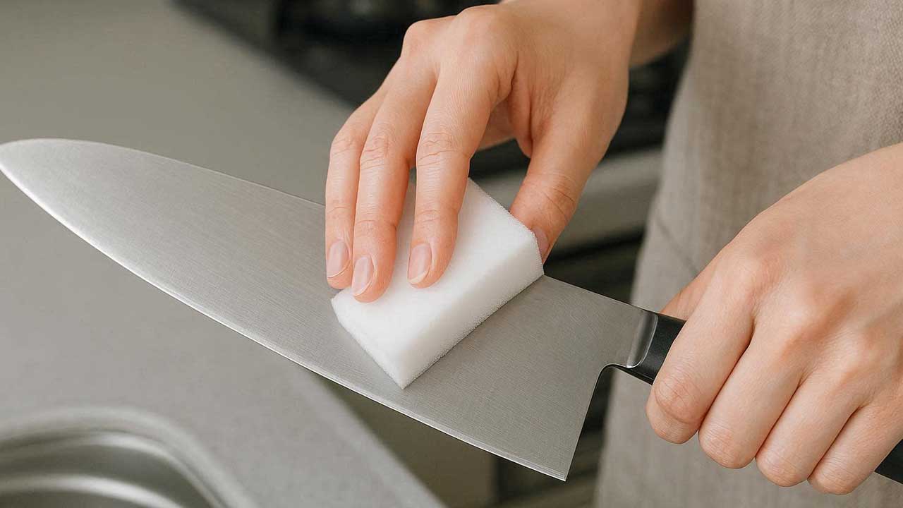 ごく軽い表面の黒ずみには、メラミンスポンジが使える場合もあります。ただしこれはステンレス包丁限定と考えたほうが安全です。
