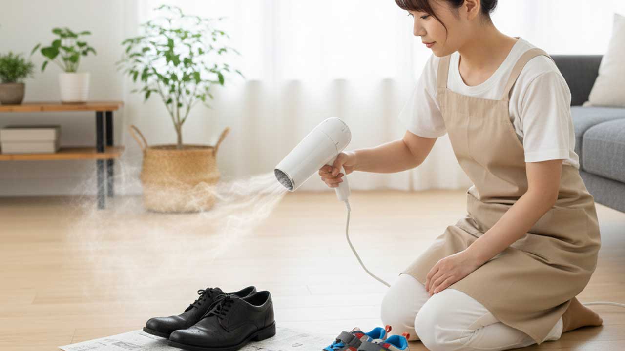 大切なのは、乾かす前にできるだけ水を減らすこと、そして風を使って湿気を逃がすこと。強い熱で一気に仕上げるよりも、靴に負担をかけない方法のほうが結果的にトラブルを防げます。
